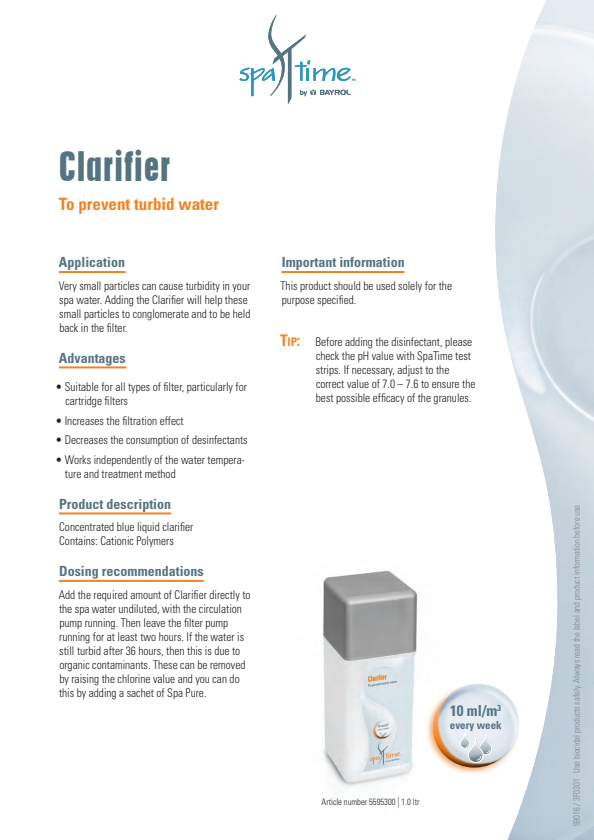 Bayrol Spa Time Clarifier 1 Litre . For adding lustre and clarity to spa water.