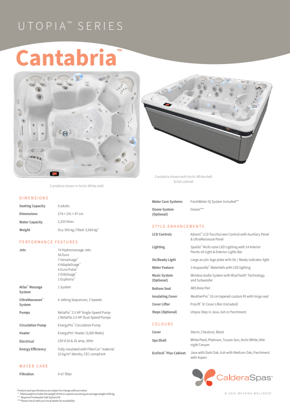 Wrapped in the signature styling of the Utopia Series, the Cantabria is equipped with every high-end feature Caldera is known for. The FreshWater® IQ and Smart Salt System, monitors and adjusts your water, keeping it softer, cleaner, and far easier to maintain. The intuitive Advent® touchscreen gives you smooth, responsive control over every setting, while SpaGlo™ multi-zone LED lighting transforms evening soaks with warm, immersive ambience..