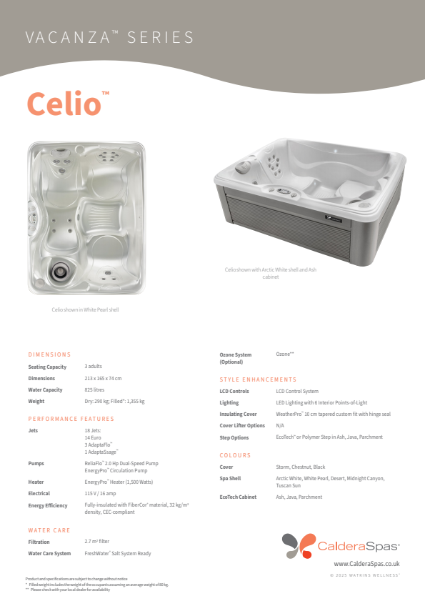 As part of the Vacanza Series, the Celio combines performance with convenience. EnergyPro™ continuous circulation and FiberCor® insulation maintain warmth efficiently, while the FreshWater® Salt System keeps water soft, clean, and easy to maintain.