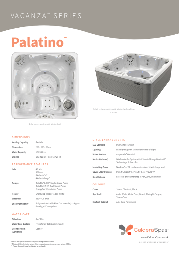 The Caldera Palatino hot tub seats 6 adults and boasts features including the Acquarella spa waterfall plus 45 powerful hydromassage jets.