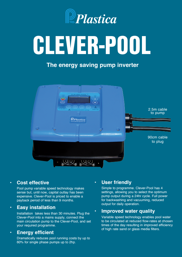 By using advanced motor control technology, clever pool pump inverter allows the user to set reduced speeds on their pump, which can mean a significant reduction in energy consumption. The Clever-Pool pump Inverter can be set to over 30 different speeds to suit a variety of tasks,  unlike any other product of it's kind, it has an advanced, user friendly control panel, which allows the user to set up to four time periods in 24 hours, all with different energy saving levels. By plugging the single speed pool pump into the Clever-Pool Pump Inverter, the single speed pump becomes a highly efficient and flexible variable speed pump that can be customised to suit the user’s needs.