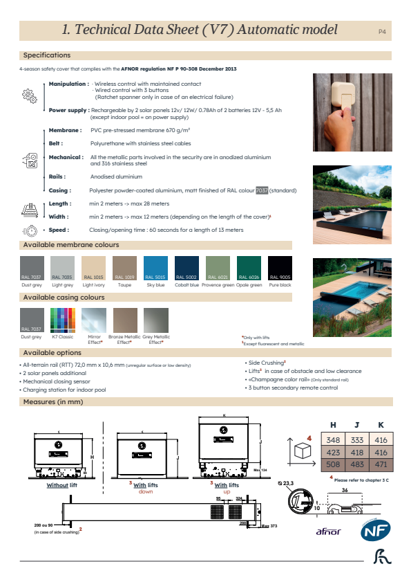 The Coverseal safety cover complies with the most demanding safety standards particularly NF P 90-308, with its exclusive locking system it makes it possible to secure your pool effectively regardless of its shape and size (up to  maximum length of 28m). The strength of the material enables it to support the weight of one or more people (150kg/m2) in the event of a fall, particularly children and pets.