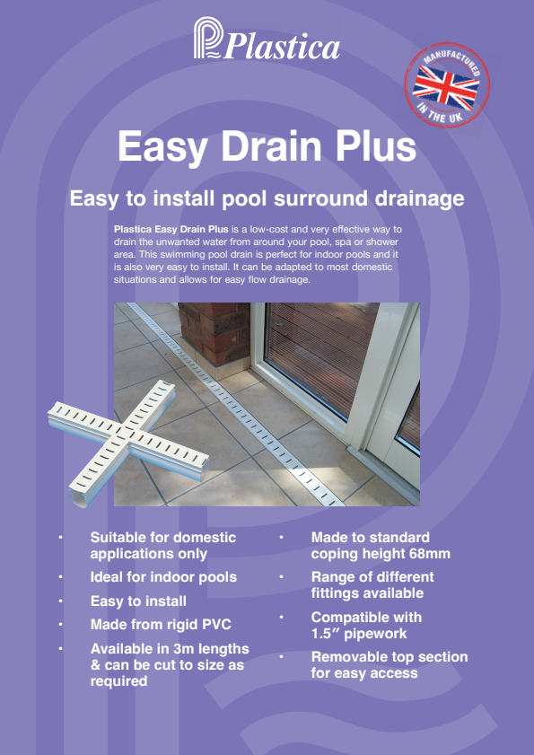 Plastica Easy Drain Plus is a high-quality drainage solution designed to efficiently and effectively remove water from your pool, spa and shower areas. The system is designed to be easy to install and maintain, making it an excellent choice for anyone looking for a reliable and cost-effective drainage solution.