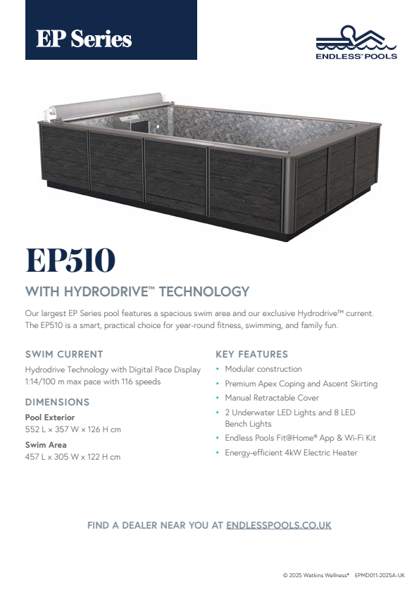 The EP510 is the largest in our EP Series, featuring a spacious swim area and exclusive Hydrodrive™ current - ideal for year-round swimming, fitness, and family enjoyment.
