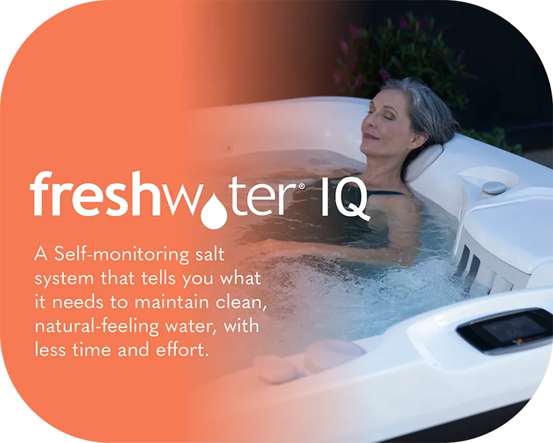 FreshWater IQ is an in-line, self-monitoring salt system that tells you what it needs to maintain clean, natural-feeling water, with less time and effort from you.  It is the combination of the FreshWater Salt System and the new Smart Monitoring Sensor. The patented, breakthrough Smart Monitoring System tests your water every hour and is more accurate and dependable than test strips. It then provides clear instructions when adjustments are needed. Relax knowing your spa will tell you how to keep your water feeling naturally fresh and ready to enjoy!