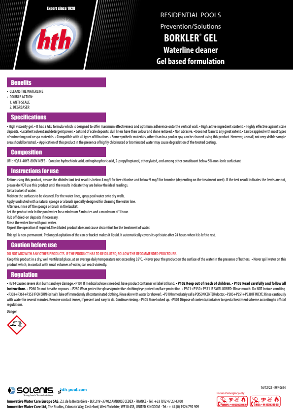 HTH Borkler Gel is a powerful, high-viscosity cleaner specially formulated to remove stubborn scale and grease from your pool’s waterline.