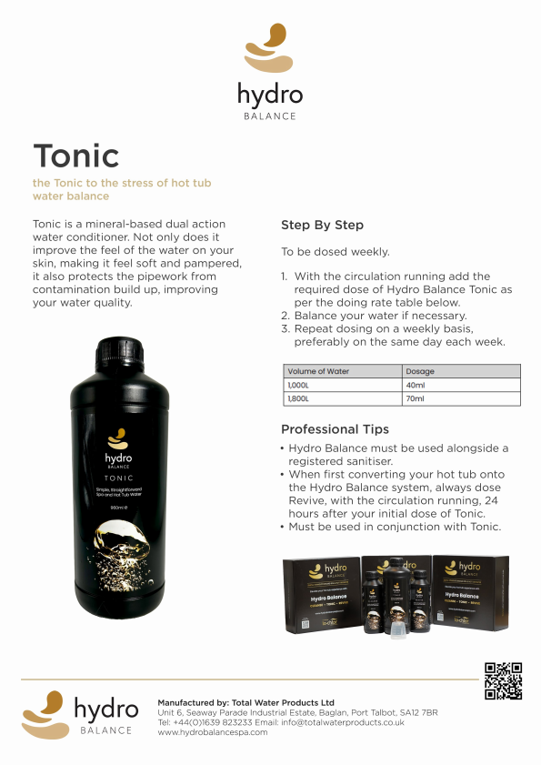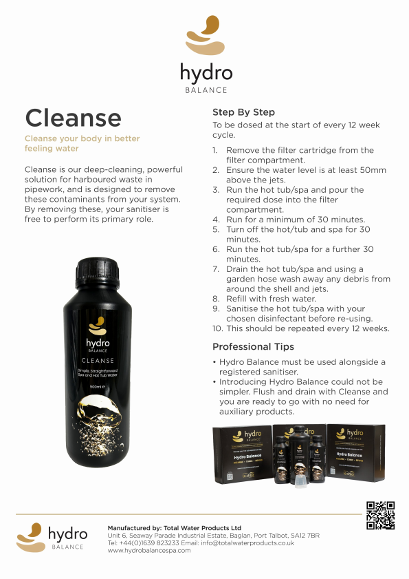 Keep your hot tub and spa water in perfect condition with the Hydro Balance Water Care Kit, a comprehensive solution designed to ensure crystal-clear, healthy water. This easy-to-use kit combines three powerful products – Cleanse, Tonic and Revive – each formulated to tackle specific water care needs effectively.