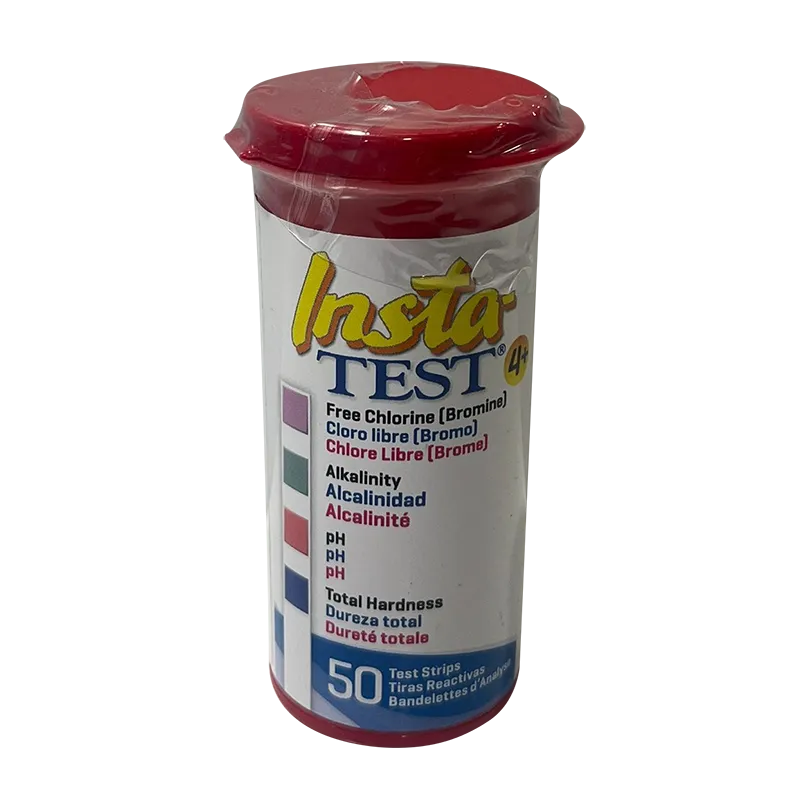 The Insta-TEST® 4 Plus pool & spa strip measures Free Chlorine 0-10 ppm, Bromine 0-20 ppm, Total Alkalinity 0-240 ppm, pH 6.2-9.0 and Total Hardness 0 -800+. This test strip is a dip-n-read strip with instant results. Each bottle includes 50 test strips packaged in a waterproof red Pop Top bottle with a hinged cap.