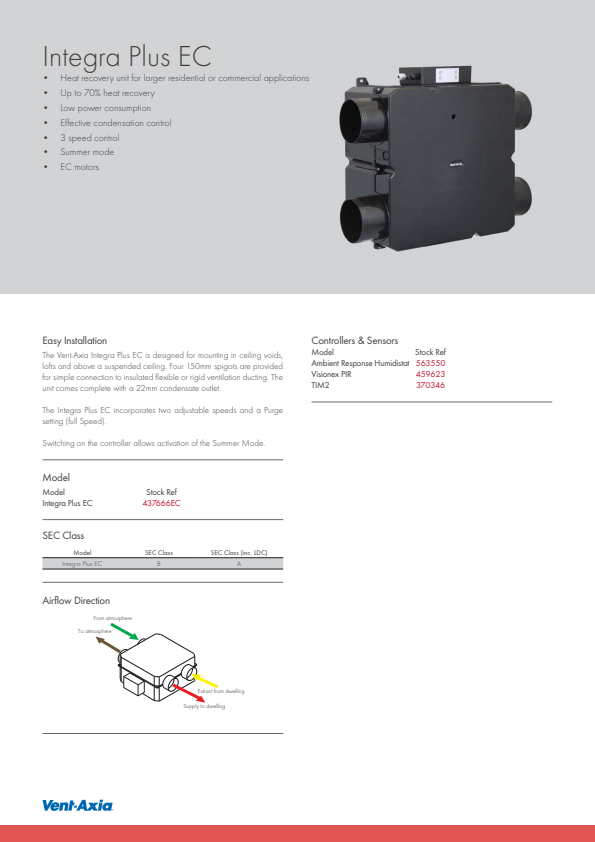 The Integra Plus EC Heat Recovery Unit delivers up to 70% heat recovery with low power EC motors, in-built 3-speed control, and summer mode, providing efficient, quiet ventilation for residential or commercial spaces while reducing energy costs.