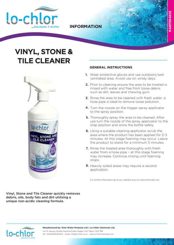 Vinyl, Stone, and Tile Cleaner effectively eliminates debris, oils, body fats, and dirt from vinyl liners, stone surfaces, pool tiles, and waterlines using its specialised non-acidic formula.