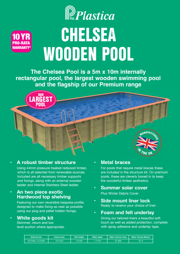 The Plastica Chelsea Wooden Above Ground Swimming Pool is the flagship model and the largest in the range.  At 5m x 10m the Chelsea wooden pool is a premium quality pool for the larger garden that is sure to be a great investment for your family time and your home.  Supplied complete with everything you need to install and maintain the pool with an optional range of extras to choose from too.