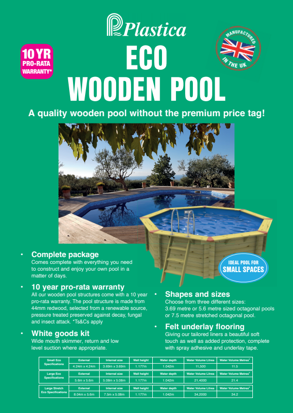 The Plastica Eco range of Wooden Above Ground Swimming Pools offer the luxury of owning a swimming pool at a much lower cost than you might expect.  There are 3 models to choose from, the Small Eco, the Large Eco and the Large Stretched Eco wooden above ground swimming pool, which all include fittings and equipment kits as standard.