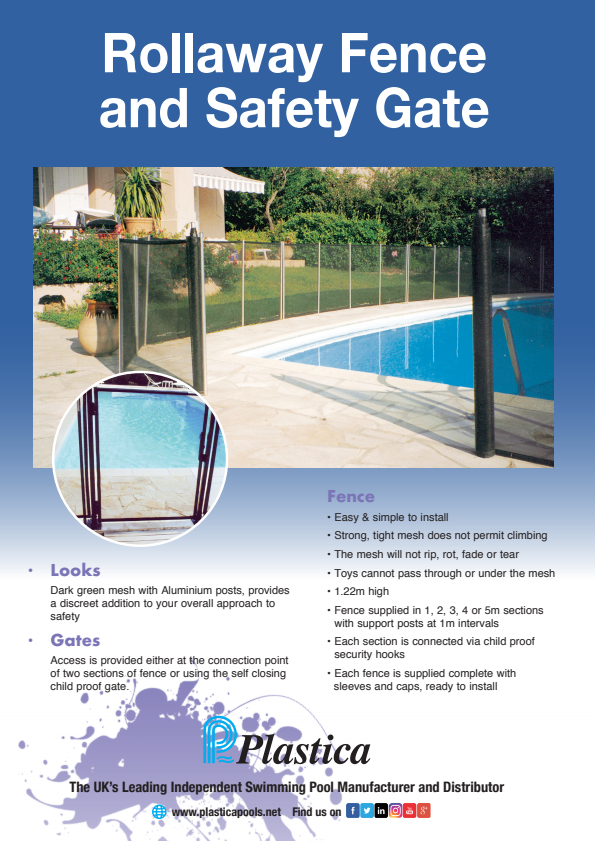 When a traditional swimming pool safety cover just isn't the right option for your pool, the flexibility of Rollaway Safety Fencing is the ideal alternative. Easy to install and to remove when not in use, Rollaway Safety Fence is made from exceptionally strong plastic coated polyester mesh and fixed to sturdy aluminium uprights and can be fixed into either concrete, grass, soil or paving.