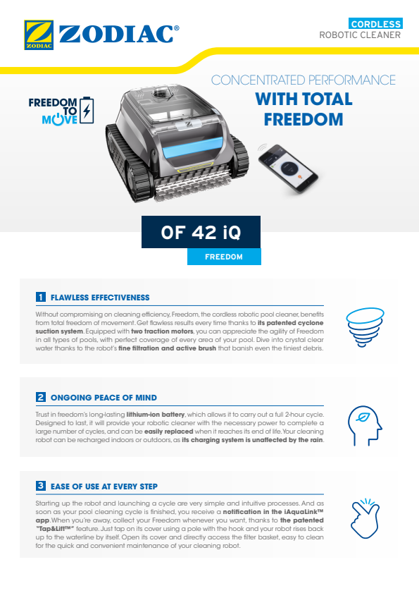 The Zodiac Freedom OF 42 iQ is a high-performance cordless robotic pool cleaner featuring a high-power lithium-ion battery designed to efficiently clean your pool’s floor, walls, and waterline.